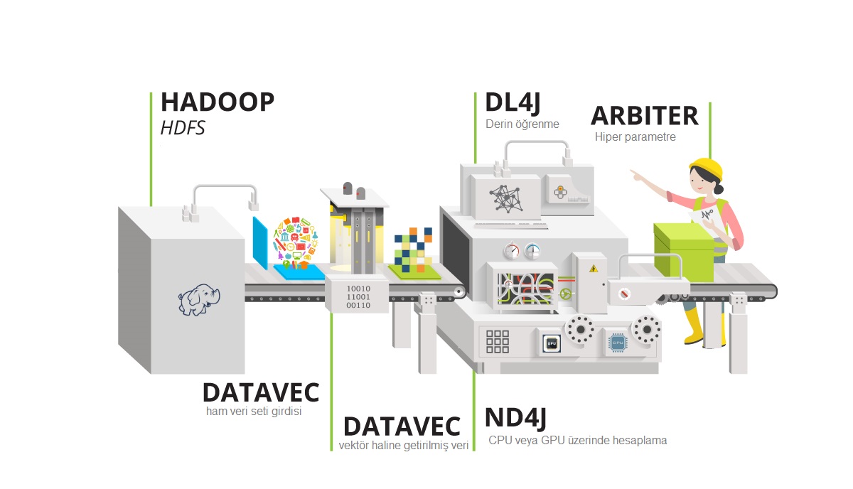 DL4J kütüphanesinin geliştiricisi Skymind adında bir firma. Bu firma kendisini ticari yapay zeka ürünleri geliştiricisi olarak tanımlıyor, temek olarak kurumsal ölçekteki firmaların “Yapay zeka patlıyor, bir ucundan tutunalım” dedikleri anda “yardımlarına” koşuyor ürünlerini daha “zeki” hale getiriyorlar. Geliştirdikleri Skymind Intelligence Layer ile büyük veri işleme, örüntü tanıma, sınıflandırma, raporlama gibi alanlarda derin öğrenme algoritmaları ile hizmet veriyorlar. Bu katmanı geliştirirken bir çok açık kaynak projeden yararlanmışlar ve kendi geliştirdikleri kütüphaneyi de açık kaynak hale getirmişler. Hizmet verdikleri firmalar sayesinde doğrudan büyük verinin içinde oldukları için DL4J; Hadoop, spark gibi çatıları da (framework) desteklemektedir. Bu kütüphanelere olan destek sayesinde Enterprise bir ürün/hizmet geliştimek tümleşik bir kütüphane ile daha hızlı geliştirilebilir olmuştur.