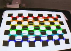Kalibrasyon işlemi esnasında drawChessboardCorners() metodunu kullanarak tespit edilen noktaları görüntü üzerinde işaretleyebiliriz bu metot ile hangi frame için hesaplanan kalibrasyon verisinin işinize yarayıp yaramayacağına karar verebilirsiniz. Bu metot aşağıdaki gibi bir çıktı verecektir.