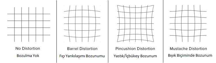 Görüntü bozuklukları kullanılan kamera, lens, açı, ışık vb. gibi bir çok etkene bağlı olarak farklı gruplara ayrılırlar. En sık karşılaşılan ve bu yazıdada ele alacağımız bozukluklar radyal bozulmalar olacak. Radyal bozulmalar genellikle kamera lensi kaynaklıdır ve kendi içerisinde üç başlığa ayrılmaktadır;