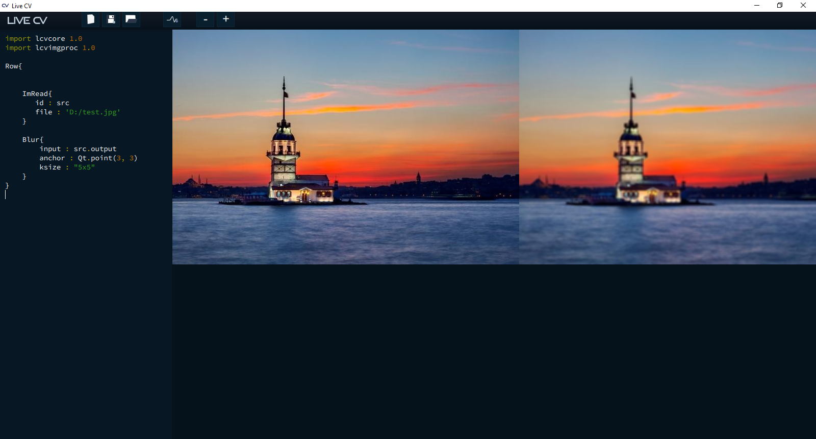 Live CV Dinu SV tarafından geliştirilen açık kaynak kod bir geliştirme ortamı. Geliştirme ortamı diyorum çünkü farklı bir görüntü işleme kütüphanesi olarak düşünülmemeli. Live CV QML (Qt Meta Language veya Qt Modeling Language) dili ile json benzeri bir yapıda geliştirme yapmayı sağlayan OpenCV wrapperı. QML ile json formatındaki elementler şeklinde OpenCV fonksiyonları kullanılabiliyor. Hızlı prototipleme, yeni başlayanlar için OpenCV’yi kavrama veya akademik çalışmalar için oldukça kullanışlı bir ortam sunuyor. Live CV bir geliştirme ortamı ile birlikte geliyor bu geliştirme ortamı oldukça basit şekilde tasarlanmış ve yazdığınız kodun aynı anda çıktısını da görmenize olanak veriyor.