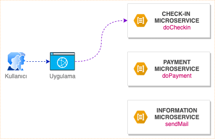 Uygulamamızın ne yapması gerektiğini belirledik, kullanıcı uygulamamız aracılığıyla rezervasyon için kayıt oluşturduğunda, uygulama (Web sitesi veya mobil uygulama) ilk olarak, Check-in servisinin doCheckin endpoint’ine bir post request yapacak. Check-in servisi gelen isteği değerlendirecek, kendi iş kuralları her neyse onları işletecek ve rezervasyon listesine kaydı ekleyecek. Bu süreçte kullanıcının kredi kartı bilgilerini kullanarak rezervasyon için gerekli ücretin tahsil edilmesi ve kullanıcının bilgilendirilmesi gerekecektir.