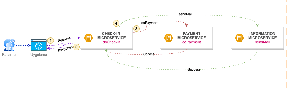 Senaryomuzda, kullanıcı isteğini karşılayan ilk servis (Check-in mikroservisi) orchestrator görevi görebilir yani transaction sürecini yönetir. Servise gelen istek, validasyonlardan ve iş kurallarından geçtikten sonra, asenkron olarak payment servisine bir istek yapar (3 numaralı bağlantı), eğerki payment işlemi ile birlikte başka bir süreç işletmek istiyorsa, yine asenkron olarak ilgili servise çağrıda bulunur (4 numaralı bağlantı).