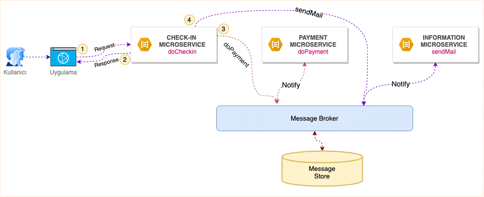 Bizim tasarladığımız servis üzerinden örneklediğimizde; kullanıcı talebi ile (1 numaralı bağlantı) check-in servisi süreci başlatır, buna paralel (asenkron) olarak ödeme işleminin başlatılması için Message Broker aracılığıyla payment servisine bir notification gönderir (3 numaralı bağlantı). Servisler iş parçacıklarını yerine getirdiğinde ise bir done mesajı fırlatır, eğer ki bir işin bitmesini bekleyen servisler varsa bu done mesajı ile tetiklenir ve süreç bittiğinde ilgi serviste bir done mesajı fırlatır. Süreci yöneten Check-in mikroservisi son done mesajı ile tetiklenir ve kullanıcıya bir mesaj dönerek süreci tamamlayabilir. Kullanıcı bildirimleri asenkron olarak da kurgulanabilir bu durumda ilk request (1 numaralı bağlantı) sonrası servis bir dumy response (2 numaralı bağlantı) dönerek sürecin başladığını bildirir.