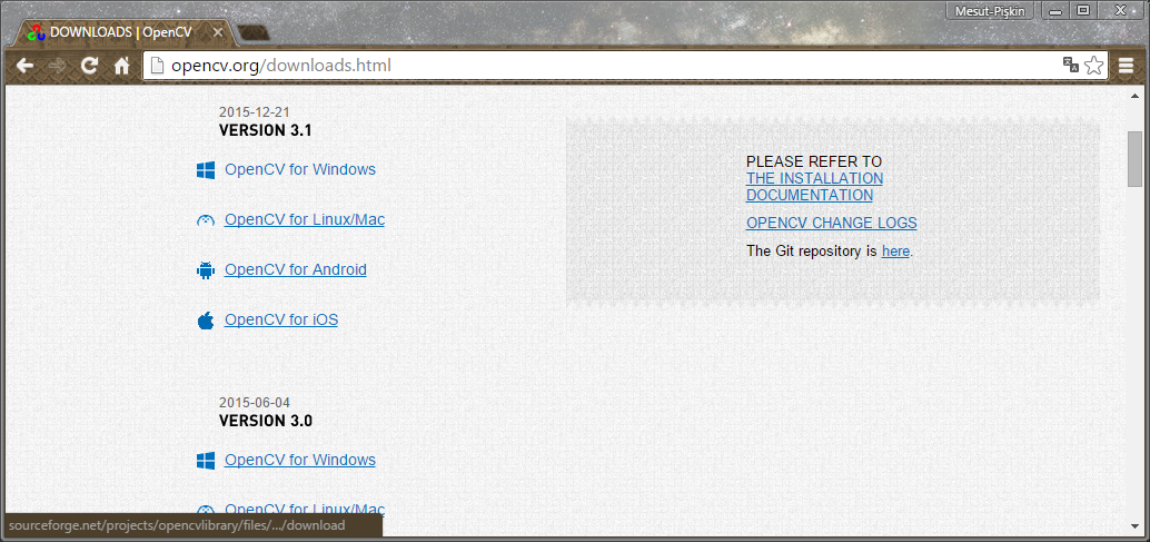 OpenCV’nin, bu yazının yazıldığı tarih itibari ile en güncel sürümü 3.1 dir. Windows işletim sistemi için OpenCV derlenmiş, sistem kütüphanesi haline getirilmiş olarak bulunmaktadır. Bu sayede kaynak kodu tekrardan derlemeye ihtiyaç olmadan kullanılabilir haldedir. OpenCV’yi http://opencv.org/downloads.html adresine giriyoruz ve indirmek istediğimiz sürümün altındaki OpenCV for Windows linkine tıklıyoruz. Örneklerde şuanda en güncel olan 3.1 sürümünü kullanacağız. İndirme bağlantısı sourceforge.net sitesine yönlendirecek ve indirme işlemi başlayacak.