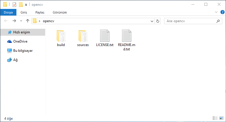 İndirdiğinizde sıkıştırılmış olarak gelecektir, çalıştırdığınızda OpenCV dosyalarını çıkartmak için bir dizin isteyecektir, burada çıkartılmasını istediğiniz dosya dizini yolunu yazarak Extract butonuna tıklayın. Dosyaları çıkarttığınız dizinde OpenCV klasörü içerisinde build ve sources diye 2 adet klasör bulunmaktadır. Build klasörü içerisinde Windows platformu için derlenmiş olarak sistem native kütüphaneler ve programlama dilleri için kütüphaneler bulunmaktadır. Sources klasöründe ise OpenCV kaynak kodları ve örnek uygulamalar yer almaktadır. Buradaki kaynak kodlar ile OpenCV’yi tekrardan derleyebilirsiniz.
